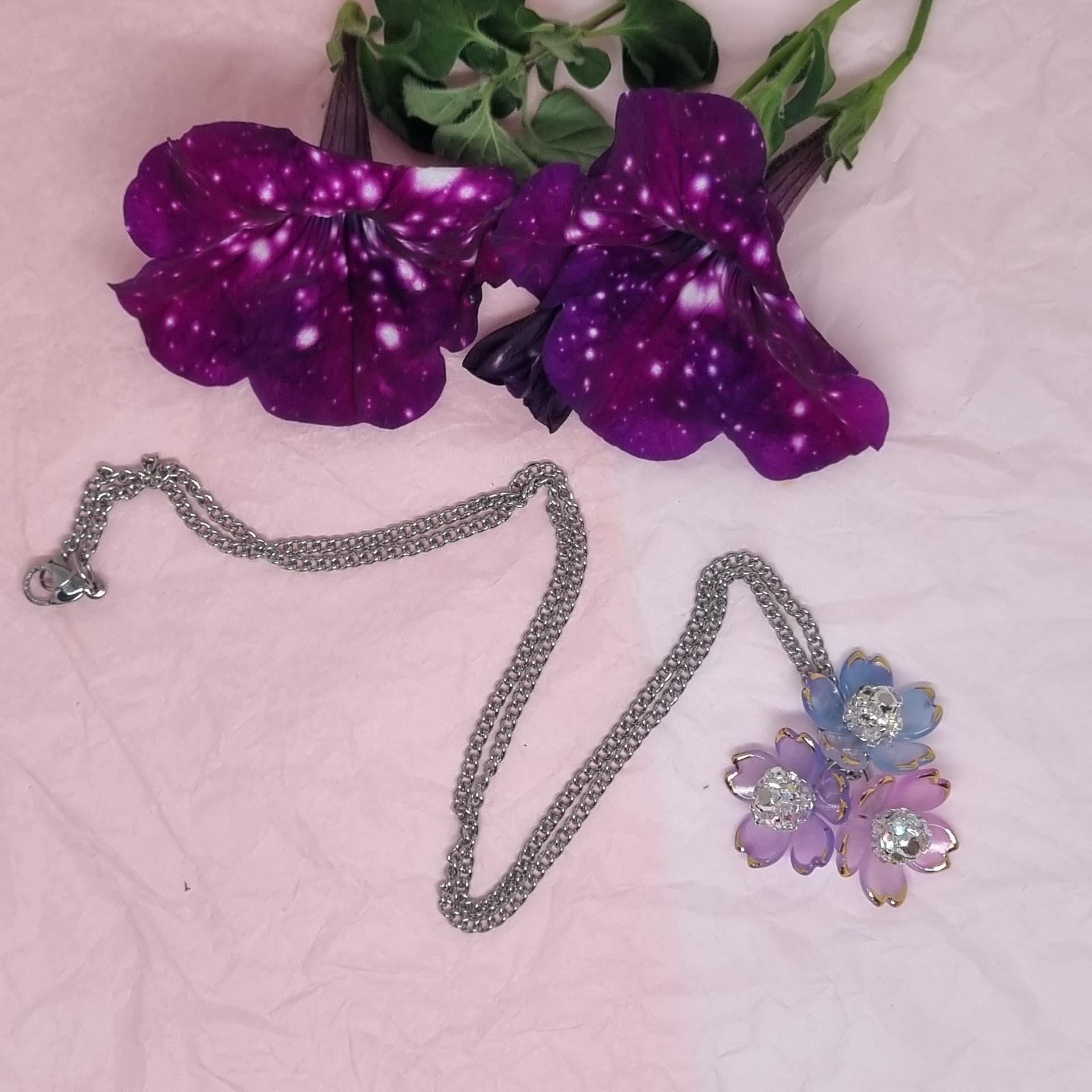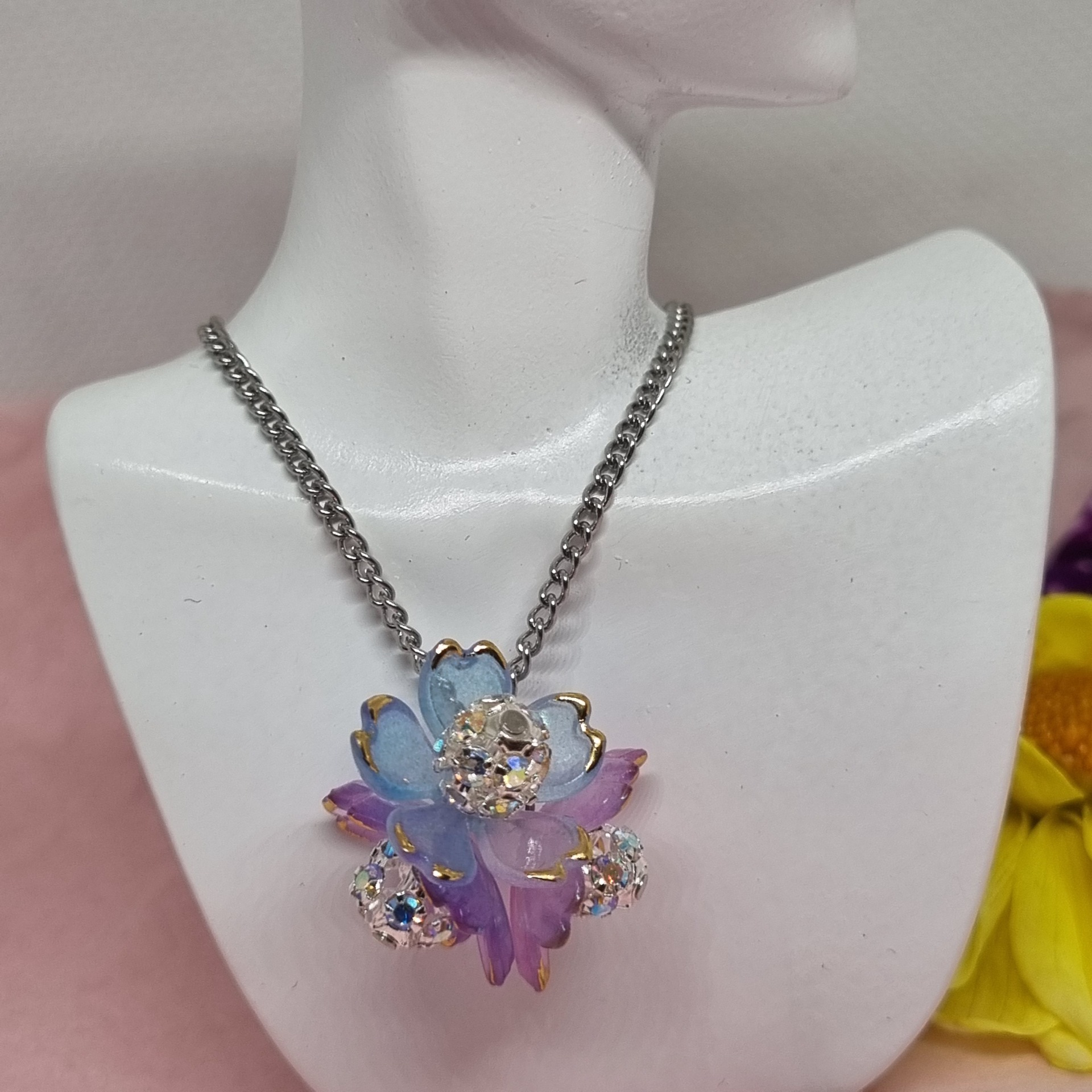 Loistokas ja näyttävä, kuin juhlasalin kimppu. Keisarinkukka on lilan ja hopean säihkyvä yhdistelmä, jossa kristallinhohto korostaa kukkien kauneutta. Se on koru, joka käntää katseet ja tuo asuun juhlavuutta.