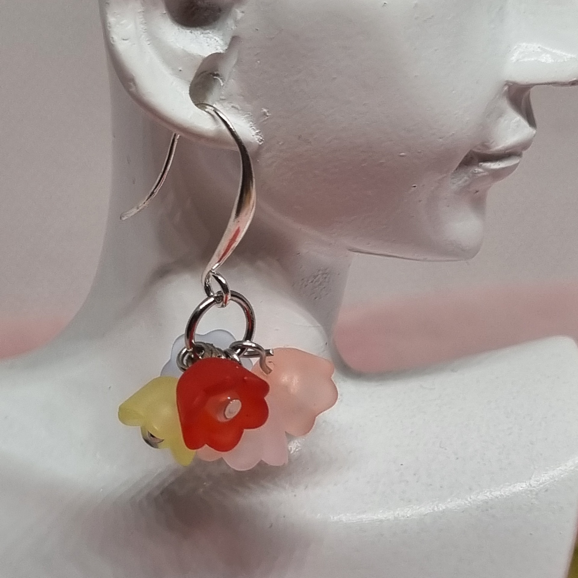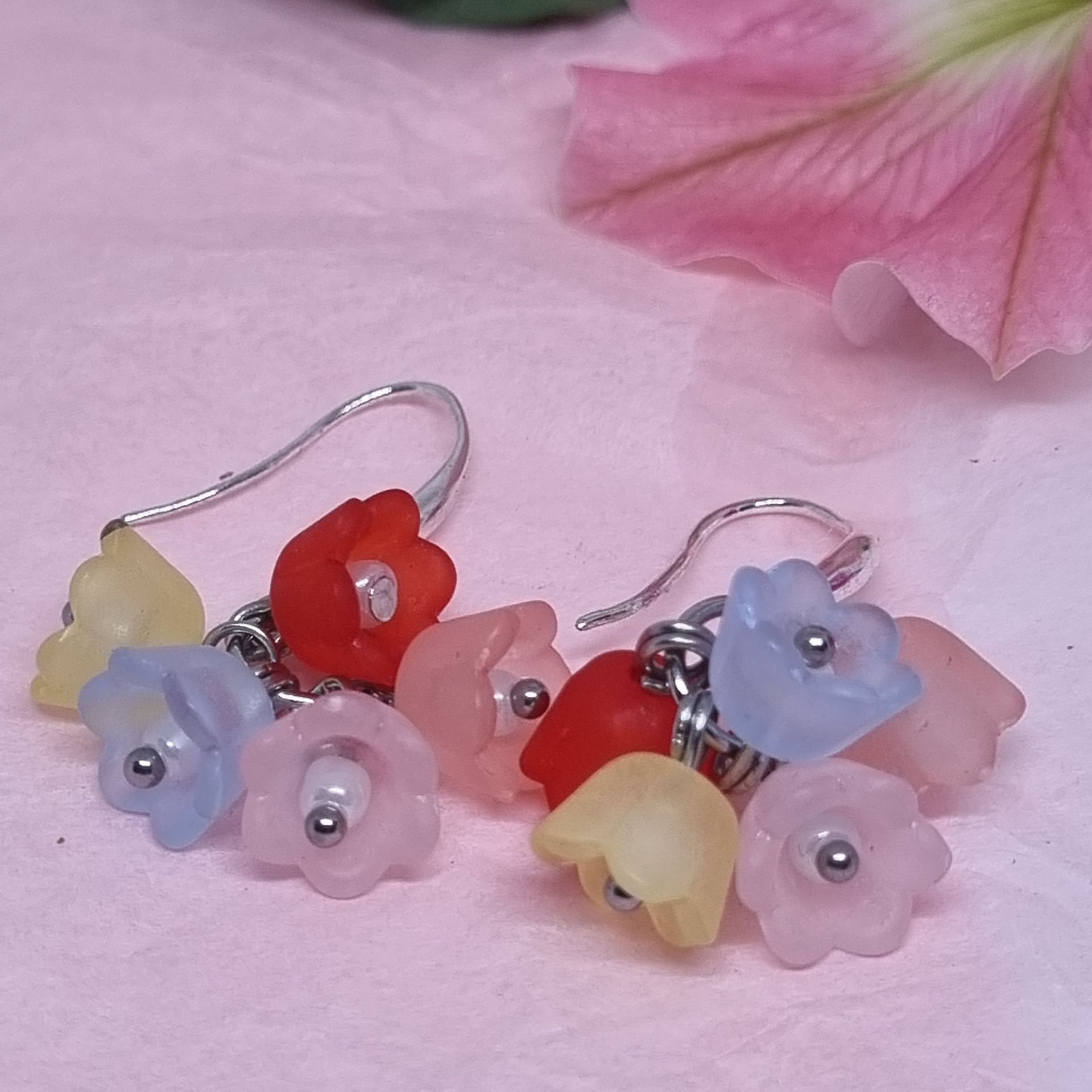 Moniväriset kukat sinisen,punaisen, persikan ja helmiäisen sävyissä. Iloinen ja kepeä koru, joka tuo mieleen kesäiset juhlat puutarhassa.