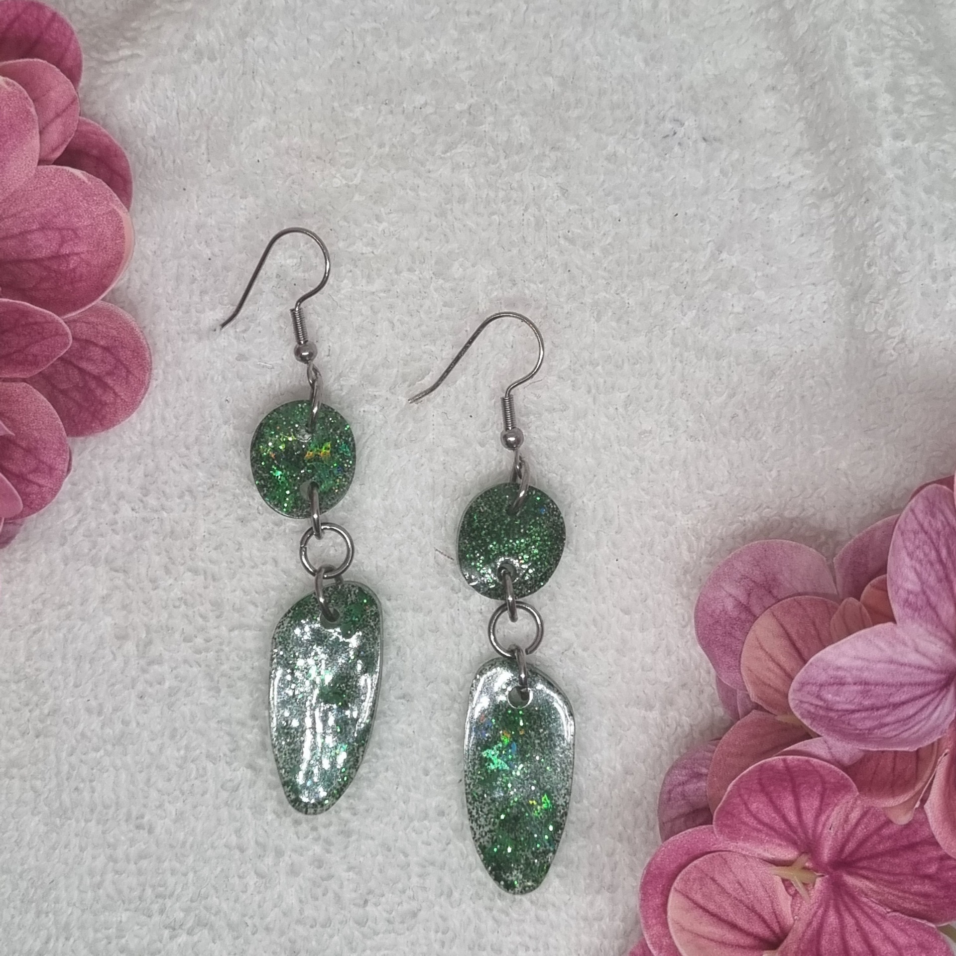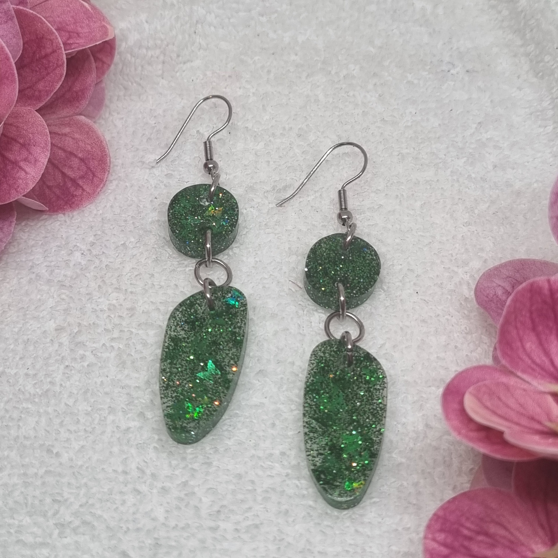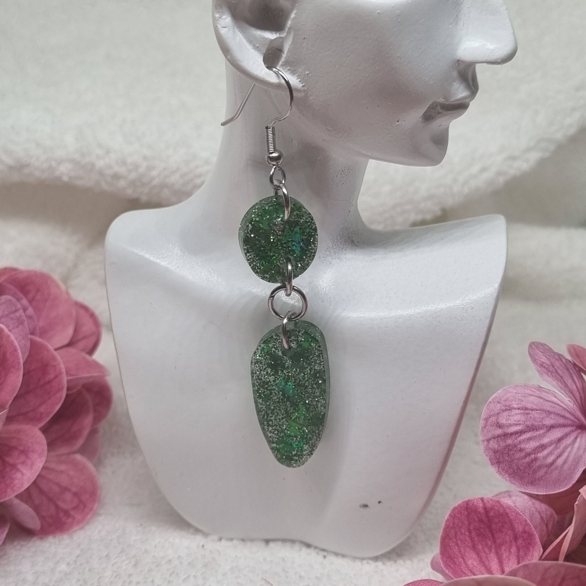 Ylempi, pyöreä osa on kuin metsän vanha puunrunko: vakaa, juurtunut, viisas. Alempi, pisaramainen muoto muistuttaa kasteesta, joka viipyy lehden kärjessä ennen kuin putoaa maahan. Kimallus sen sisällä ei ole pelkkää glitteriä – se on metsän oma tähtitaivas, vihreänä hohtava, elävä ja syvä.